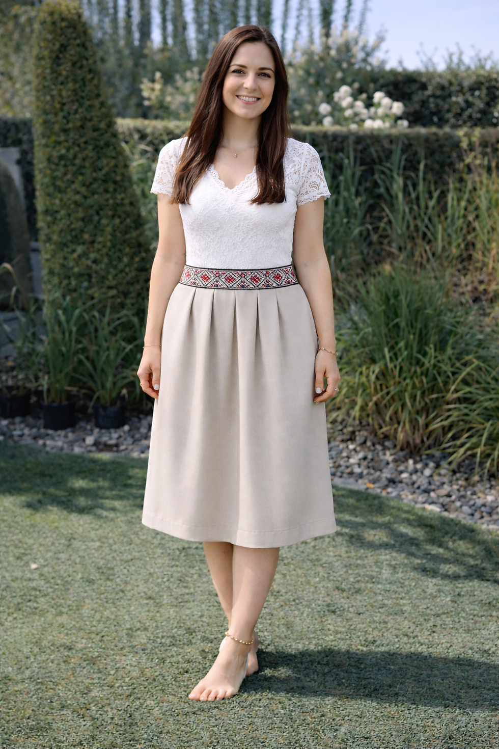 Charakteristisch für dieses Modell ist die schräge Stoffaufteilung, bei der einfarbige und gemusterte Stoffe liebevoll miteinander kombiniert werden.
